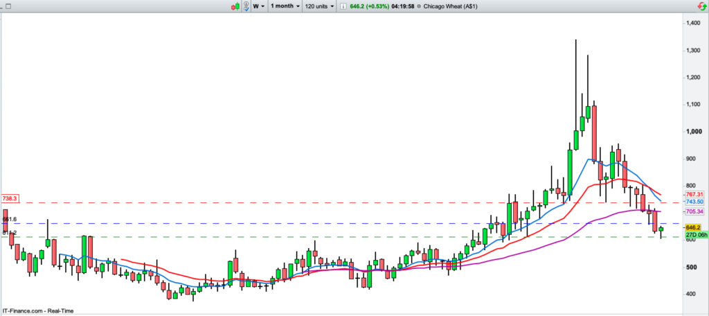 The price of Wheat continues to slide, following the break of the major Support level at around the area of 740, the market has then retested that level, consolidated for a while, and then finally, broke to a new Lower Low.