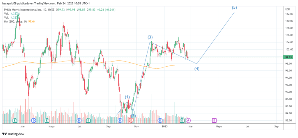 Si nos fijamos en la gráfica, lo que vemos es que el precio también viene en tendencia alcista (presión de la demanda) y que en las últimas sesiones diarias viene haciendo una consolidación, que podemos entender como posible reacumulación. Si estamos en lo correcto, lo que podemos esperar es otro posible impulso alcista proporcional al anterior o la quinta alcista del módulo de Elliott que también vemos dibujado en el chart. Recordamos, como siempre, que esto no son recomendaciones de compra.