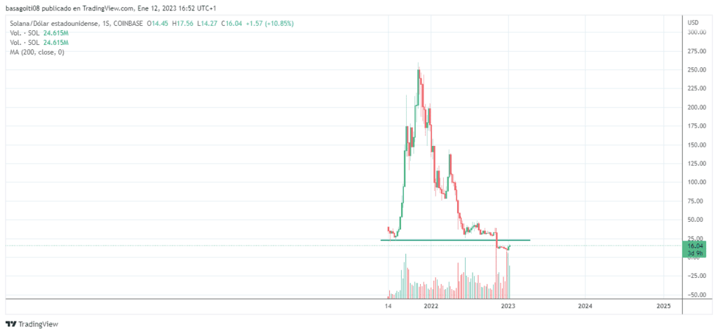 En parte la subida ha sido causada por el boom de la memecoin Bonk, por lo que entendemos que la subida puede que no sea orgánica, sino una bulltrap. En cualquier caso, como vemos en el gráfico de abajo, vemos que el precio se está acercado a una zona de resistencia de mucha relevancia en los entornos de los 22,50$, donde el precio podría rebotar si sigue mostrando agotamiento en la subida. Mi escenario es esperar a esa zona de control para actuar, pero recuerdo que esto no son recomendaciones para operar.