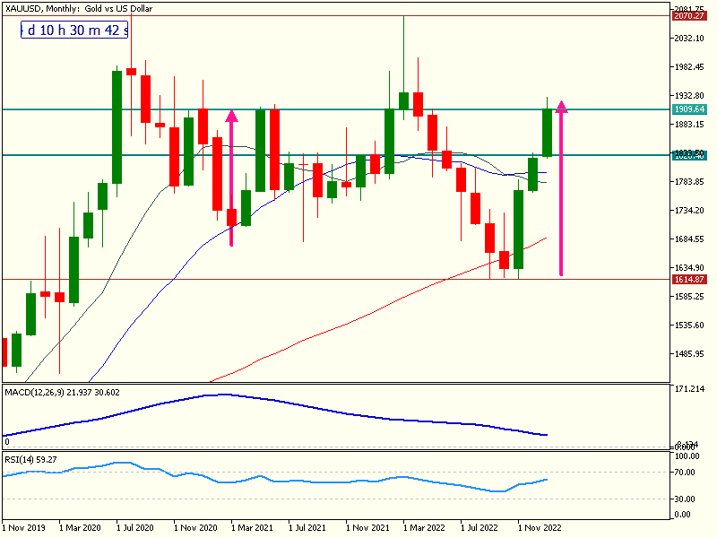 Gold’s recent moves almost straight up from $1,600 are the most aggressive since a similar attempt was made in March 2021 (seen to the left). Also, it has travelled a lot further.