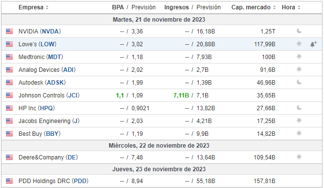 De primeras, seguimos en temporada de resultados corporativos de las principales empresas del SP500. Os lo compartimos para que lo tengáis en cuenta si estáis invertido en alguna de estas. Destaca claramente Nvidia, una de las 7 magníficas, que desde nuestro punto de vista está bastante sobrevalorada con un PER por encima del 120.