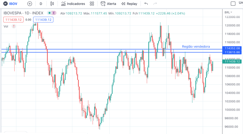 O Ibovespa se aproxima cada vez mais de possível região vendedora, vamos aguardar e esperar a entrada de fluxo vendedor para tentar encaixar uma operação de reversão.