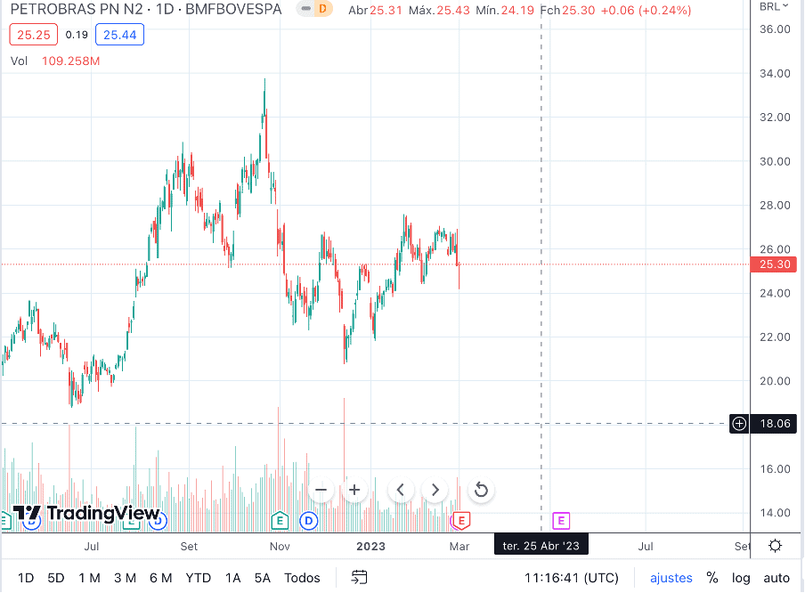 As ações da empresa vem sofrente muito devido a questões políticas, que empurraram o preço para baixo, vide gráfico.