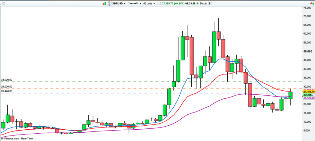 A decisive break above the 29,000 could see the market heading towards the next level around the 34,000 while a break below the 26,400 may signal the continuation of the higher timeframe trend, with the next level being around the 25,100.